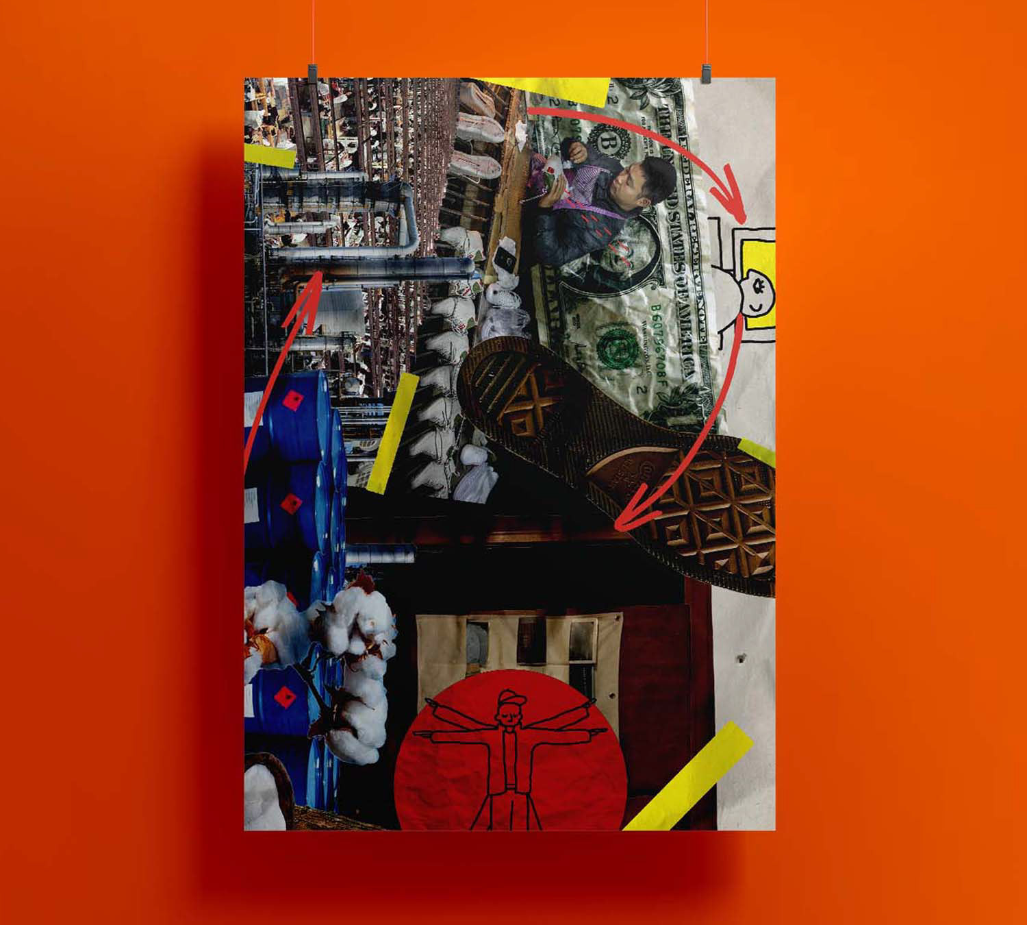 Instead of taking a pretentious and removed stance in this work, I wanted to acknowledge that I’m also part of the equation. A lot is illuminated about the darker parts of the global market by just taking a look at my own personal consumption habits. I can take something small, like an outfit I may be wearing on a given day, and see where it fits into a larger, more overwhelming picture. What did my jacket take to make? Who had to make it and how were they treated? How did it get to me? Why did I want it in the first place? Where will it end up when I can no longer use it? I, along with many others, am enticed by the instant gratification of buying cool products that are affordable and sent to your door immediately. We don’t always consider the hidden human and environmental costs.
